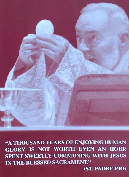 Reflections of St. Padre Pio—Feast , Sept. 23 “A thousand years of enjoying human glory is not worth even an hour spent sweetly communing with Jesus in the Blessed Sacrament.” “Run to the feet of Jesus in the Blessed Sacrament.” “Kneel down and render the tribute of your presence and devotion to Jesus in the Blessed Sacrament. Confide all your needs to him, along with those of others.” “Stay with me, Lord, because I need to have You present so as not to forget You. You know how easily I abandon You; Stay with me, Lord, because I am weak, and I need Your strength so as not to fall so often; Stay with me, Lord, because You are my life and without You, I am without fervor; Stay with me, Lord, because You are my light, and without You, I am in darkness; Stay with me, Lord, to show me Your will; Stay with me, Lord, so that I can hear Your voice, and follow You; Stay with me, Lord, because I desire to love You ever more and to be always in Your company; Stay with me, Lord, if You want me to be always faithful to You; Stay with me, Lord, because my soul is so poor that it desires to be for You a site of consolation, an abode of love.” “In the most holy sacrament of the Eucharist, in this sacrament of love, we have true life, a blessed life, and true happiness.” St. Padre Pio pray for Eucharistic Adoration & adorers! You may purchase this prayer card from our catalog here (D-19) (Listed under Bookmarks, Cards and stickers in the catalog section of our website) |